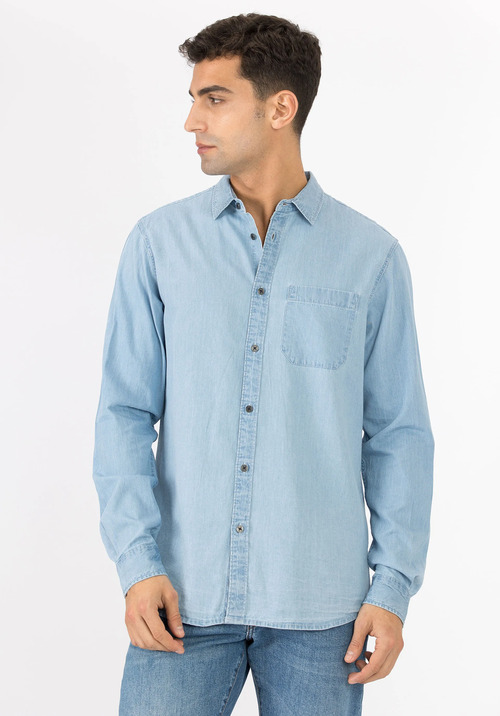Camisa denim con cuello solapa y manga larga. Bolsillo delantero. Cierre frontal con botones.